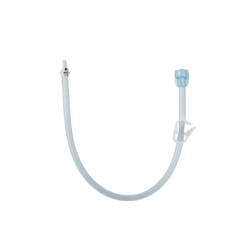 La extensión ENFit MIC-KEY para bolos permite la administración intermitente mediante jeringa conforme a protocolo de nutrición enteral. Incorpora clamp para control del flujo.
